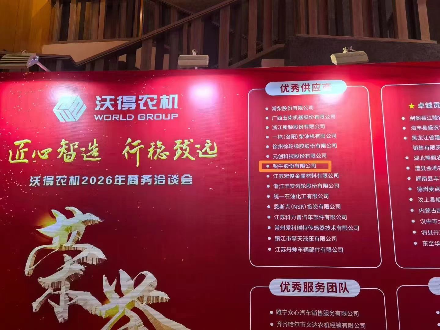 Ruiniu Stock Company Limited is awarded the title of “ Excellent Supplier in 2025” by FM World Agricultural Machinery Company at the FMWorld Agricultural Machinery's 2026 Business Negotiation Conference.